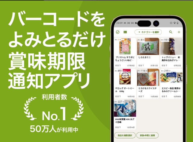 方法は簡単。バーコードを読み取るだけで、商品名や写真まで登録できます。賞味期限の1ヶ月前に通知が来るようにセットしているので、食品ロスを出すことなく暮らしています。