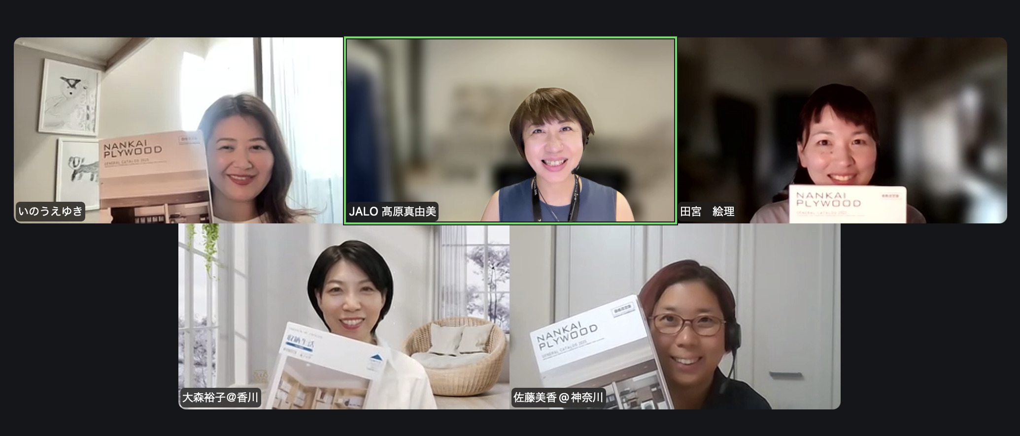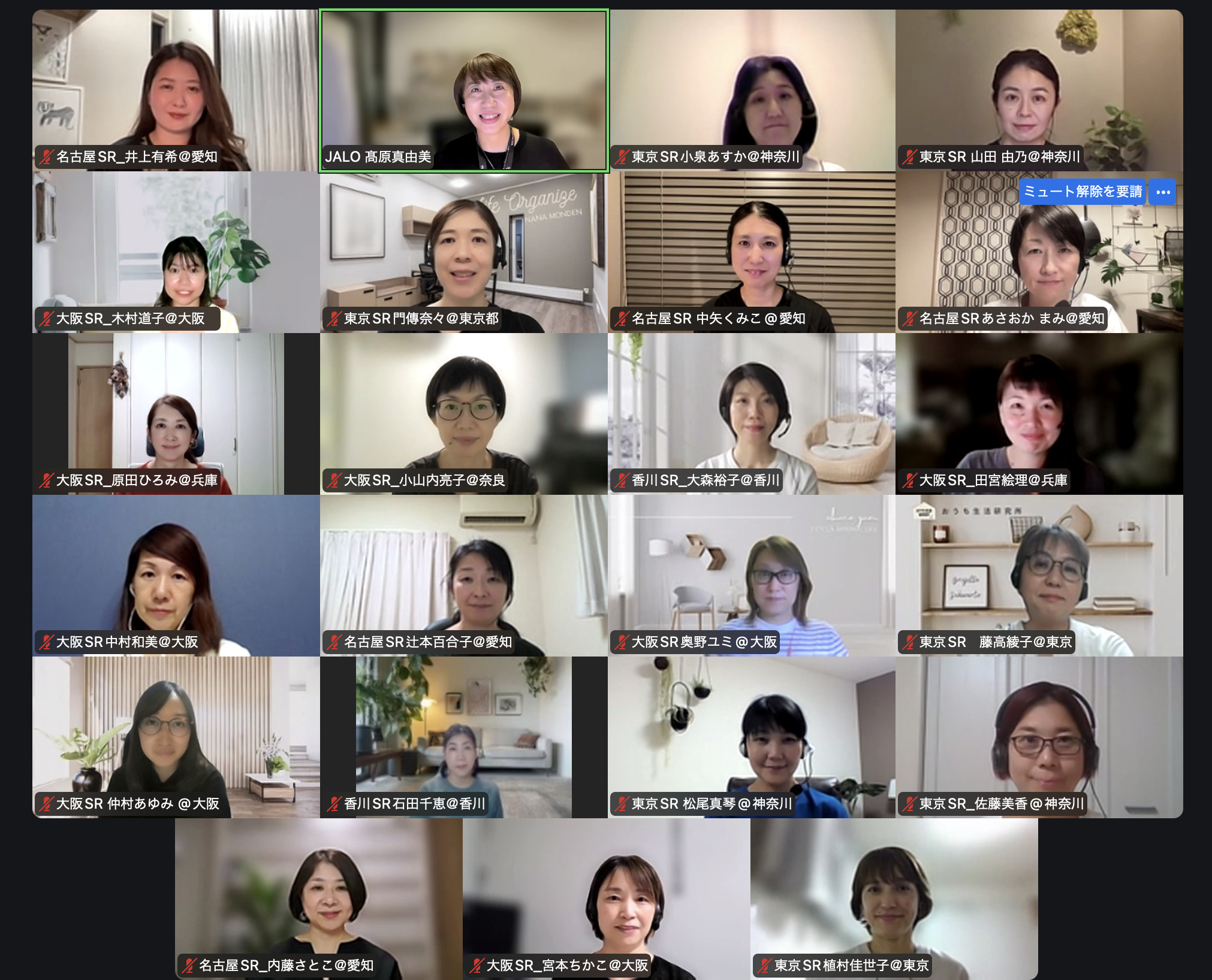 香川県在住の大森裕子さん(四段目右から左から四番目)、香川県在住の石田千恵さん日々の“報連相”はビジネスチャットツールでのやり取り中心ですが、より良いショールーム運営のためには、ライフオーガナイザー同士での情報共有や連携も欠かせません。そのため先日の9月11日(木)には各ショールームチーフによるオンラインミーティングを、9月29日(月)夜にはスタッフ全体ミーティングを実施しました。