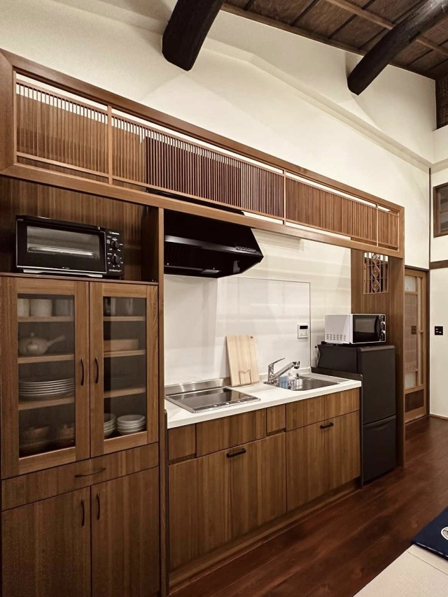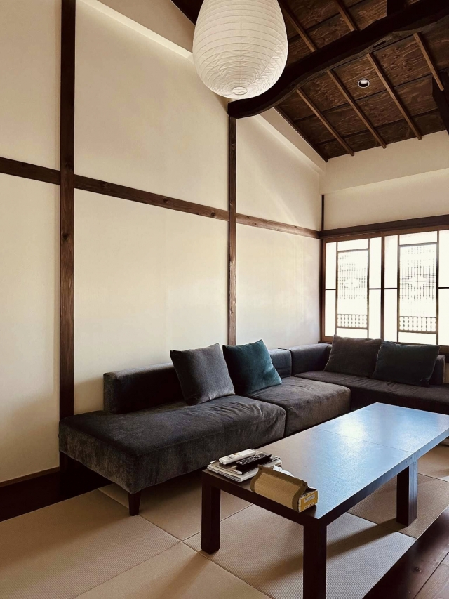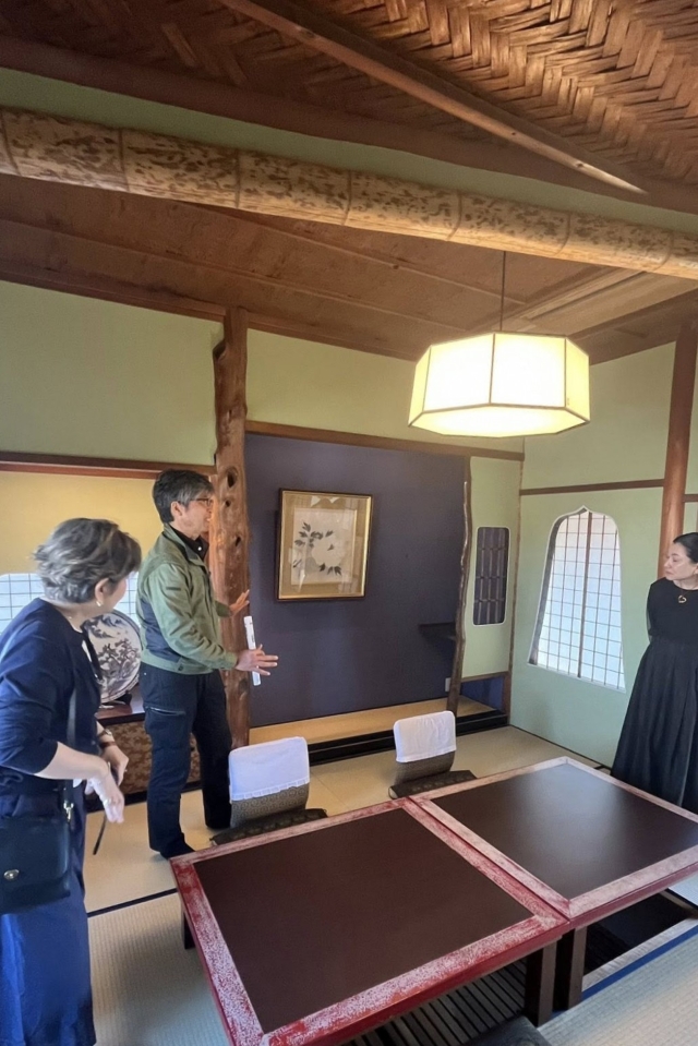 その後、十熊さんがリノベーションを手掛けた多賀茶焙煎所2階部分の民宿を見学。もとは芸妓の置屋だった町家だそうで、ビフォーの写真を交えながら、リノベの際のお話や施工時の工夫などををくわしく解説いただきました。