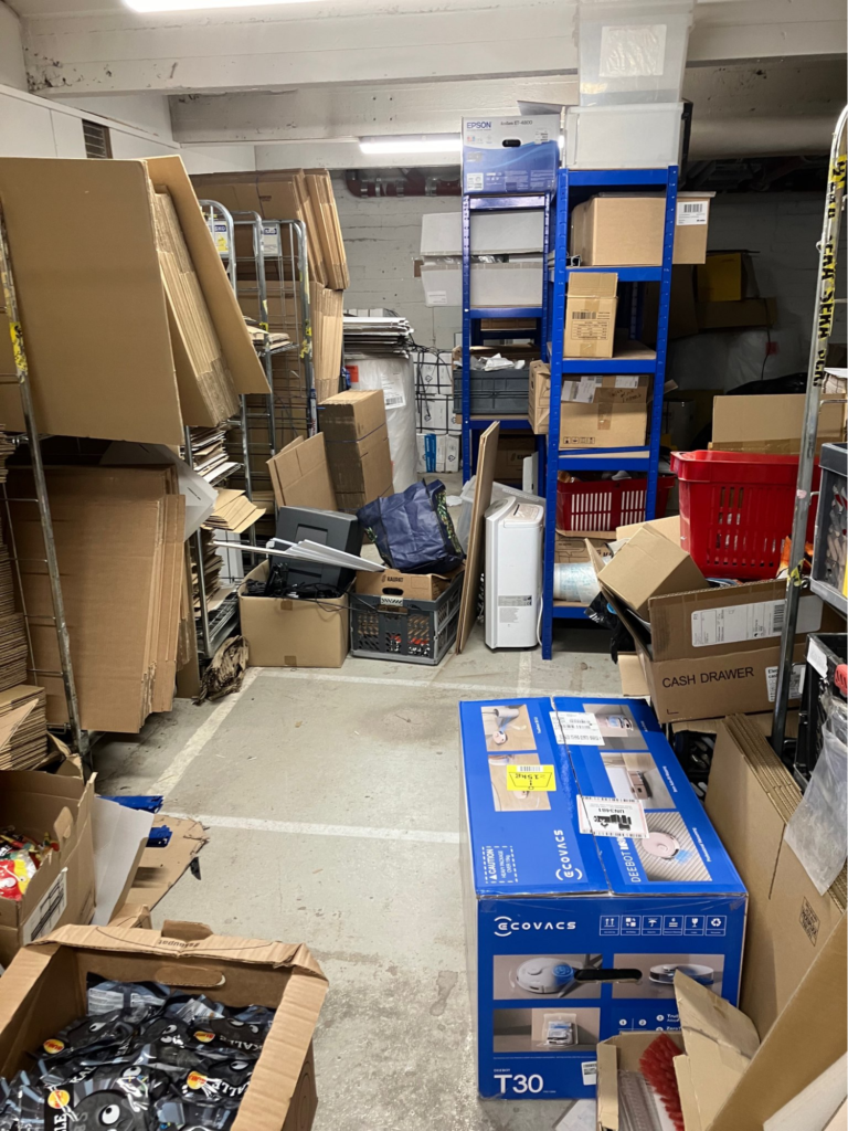 現地の倉庫やオフィスには、道具、在庫商品、文房具、食品、家具、家電など、役割の異なる物が混在し、必要な物が埋もれやすい状態でした。