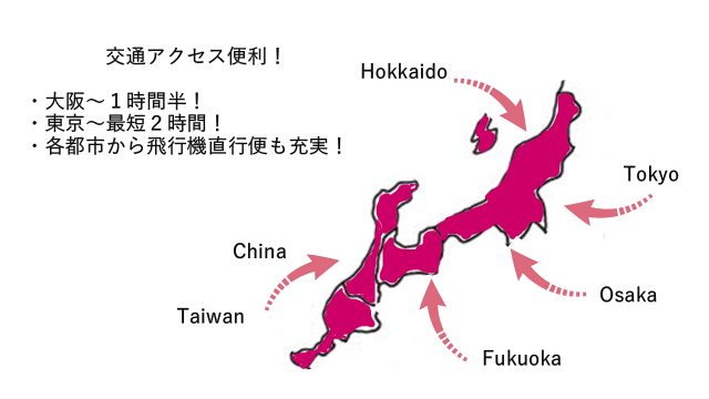 東京からは新幹線で約2時間。実は、大阪・福岡・北海道などの主要都市からも飛行機で2~3時間程なので、全国どこからでも来ていただきやすいと思います!
