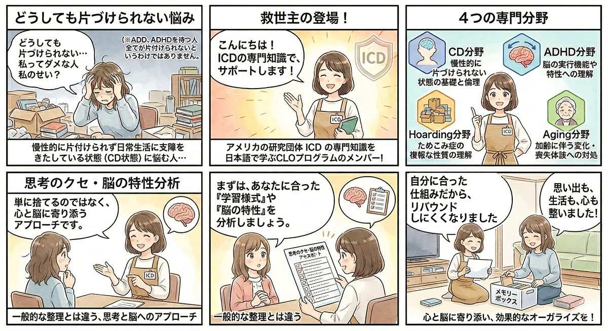 <CLO資格認定プログラムとは、 ADHD(注意欠如・多動症)・自閉スペクトラム症・ホーディングと呼ばれる溜め込み癖・脳の機能障がい等を一因として、慢性的に片づけられず日常生活に支障をきたしている状態(Chronic Disorganization=CD状態)の方のサポートに必要となる専門的な知識と技術を継続的に学ぶプログラムです。 >
