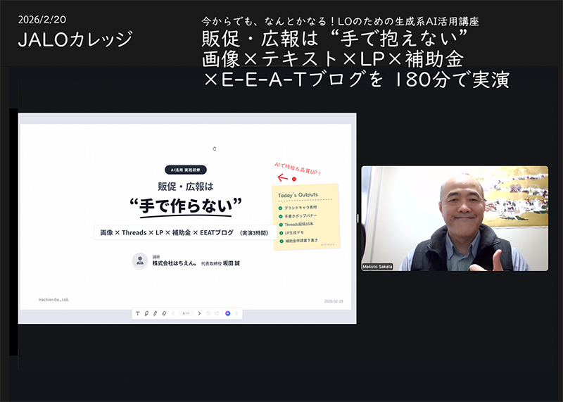 2月のテーマは、「今からでも、なんとかなる!LOのための生成系AI活用講座 販促・広報は“手で抱えない” 画像×テキスト×LP×補助金×E-E-A-Tブログを 180分で実演」でした。
