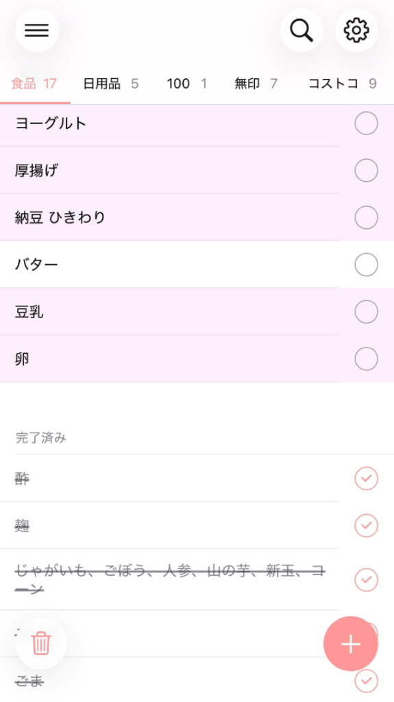 買い物リストは、スマホのToDoアプリを使用し、行く場所ごとに分類。毎週買うものはリストに残し、店内の回る順に並び替えています。