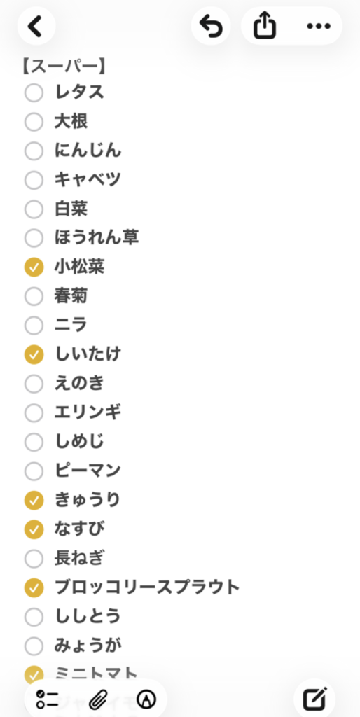 買い物リストはスマホのメモアプリを使用し、売り場順に並べています。